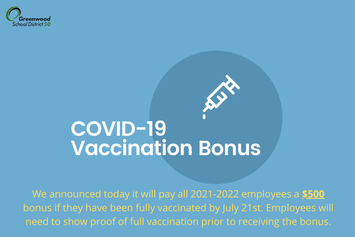 Greenwood School District 50 announced today it will pay all 2021-2022 employees a $500 incentive if they have been fully vaccinated by July 21st. Employees will need to show proof of full vaccination prior to receiving the bonus.