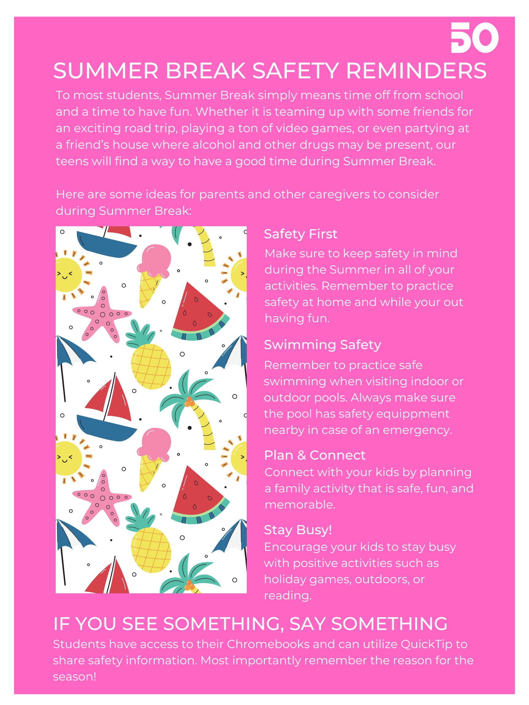 Remember, if you see something, say something. Students can go to the district website to enter a quick tip.Stay safe and enjoy your summer break.