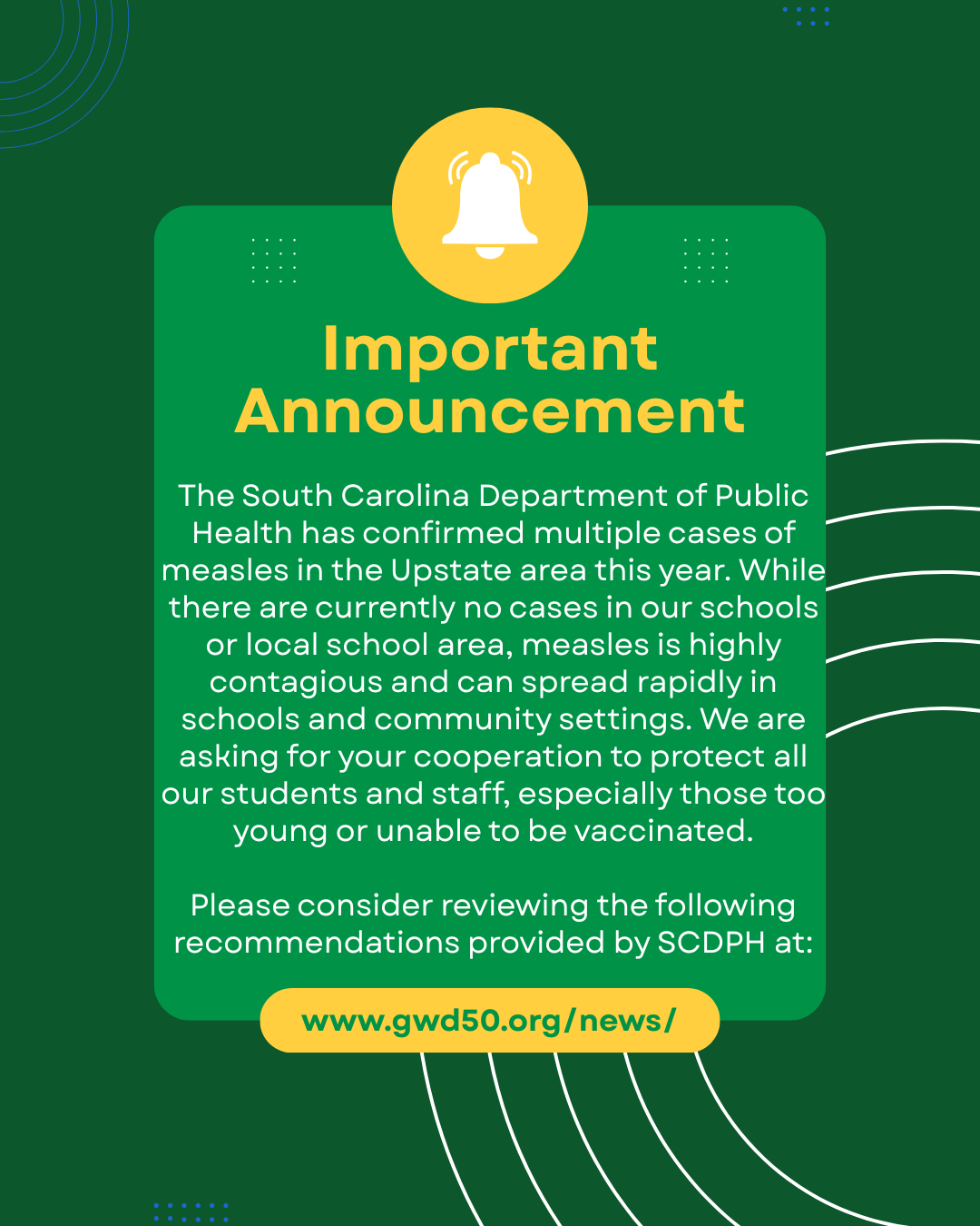 We would like to inform you that the South Carolina Department of Public Health has confirmed multiple cases of measles in the Upstate area this year. Thus far, all the cases have been in unvaccinated individuals. While there are currently no cases in our schools or local school area, measles is highly contagious and can spread rapidly in schools and community settings. We are asking for your cooperation to protect all our students and staff, especially those too young or unable to be vaccinated.